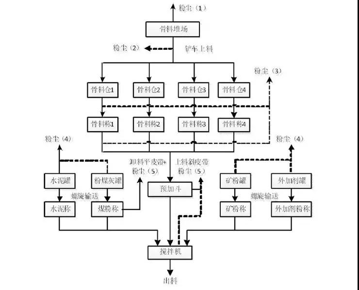 混凝土生產(chǎn)過程中主要粉塵分布及形成如下圖所示: