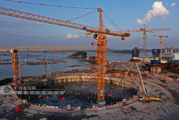 龍門大橋西錨碇位于廣西欽州龍門港鎮(zhèn)茅尾海淺灘上,由中交路橋建設(shè)有限公司承建,采用筑島圍堰形成陸域施工環(huán)境的方式進行作業(yè),在橋梁建設(shè)史上首次運用“大直徑樁+二期槽”的圓—矩咬合樁支護結(jié)構(gòu),形成一個方便基礎(chǔ)施工的直徑90米的圓形圍堰。自12月13日開盤澆筑以來,龍門大橋西錨碇填芯澆筑總計投入4個溜槽、9條生產(chǎn)線、12臺天泵、22個專項小組、128臺運料罐車、300名建設(shè)者,經(jīng)過連續(xù)24小時人不卸甲、機不停轉(zhuǎn)地施工作業(yè),最終僅用時86小時,鋼筋總用量達到480噸,澆筑面積約6358.5平方米,高效優(yōu)質(zhì)地完成5.86萬方混凝土的一次性連續(xù)澆筑。