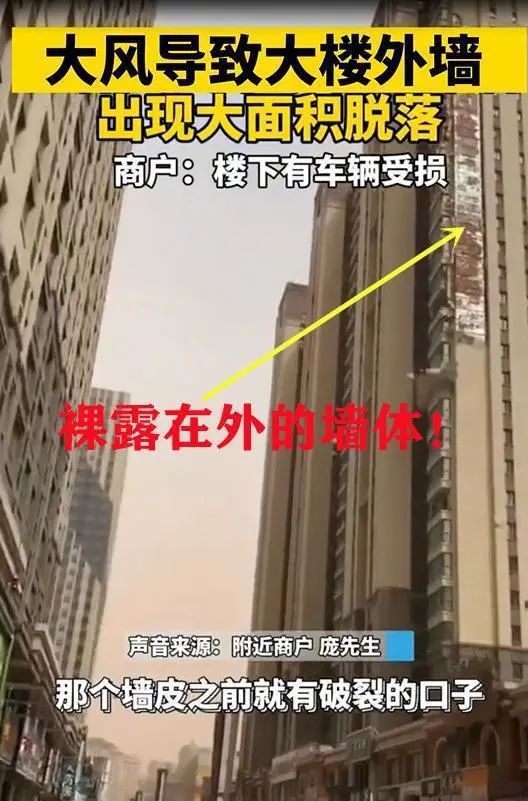 現(xiàn)如今買樓買車已經(jīng)成為了廣大人民群眾肩上最大的負(fù)擔(dān),特別是買樓,有些人辛苦操勞了一輩子,在一二線大城市里還不夠付個首付,不過老百姓最被看重的是貨真價實,東西貴點沒關(guān)系,但是要保證質(zhì)量就好。不過正所謂無商不奸,有些開發(fā)商為了謀求利益的最大化,不惜偷工減料,出現(xiàn)了一棟又一棟豆腐渣工程,而這種工程一旦遇到極端天氣就會變得極其脆弱。近日,長春因大風(fēng)天氣導(dǎo)致大樓外墻大面積脫落的視頻走紅網(wǎng)絡(luò),引發(fā)了網(wǎng)友的廣泛關(guān)注和熱議。