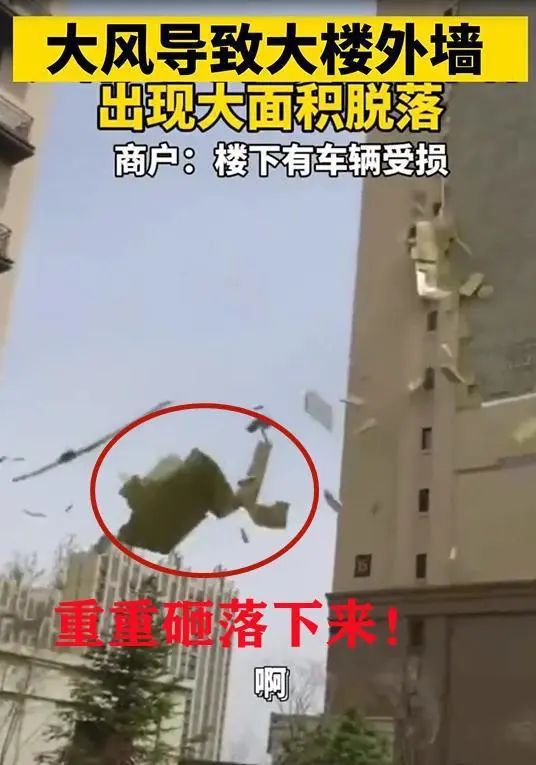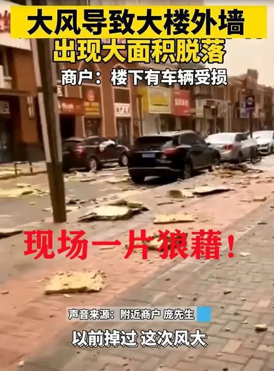 被大風(fēng)刮掉的外墻重重的砸下來,有的砸到了地面上,有的砸到了車上,有的砸中了商店的牌匾,現(xiàn)場一片狼藉,據(jù)知情者爆料:這個墻皮之前就有破裂的口子,以前就掉過,這次風(fēng)太大都刮了下來。