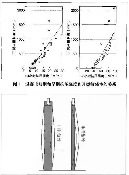 3)凡是提高早期強度的措施對混凝土后期性能都會有損害,這已是國內(nèi)外專家的共識。前RILEM主席、德國混凝土專家RupertSpringenschmid證明控制混凝土12小時抗壓強度不超過6MPa,就可以避免混凝土的早期開裂;我國混凝土專家黃士元經(jīng)過試驗得出結(jié)論:可用混凝土24小時抗壓強度不超過12MPa來控制混凝土的早期開裂(見圖4)。