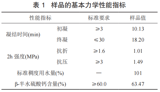 樣品的基本性能指標(biāo)見表 1,參照國(guó)家現(xiàn)行標(biāo)準(zhǔn) GB/T 9776—2008《建筑石膏》中 1.6 級(jí)的要求。