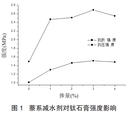 減水劑作為一種改善料漿和易性的材料,能夠明顯增大鈦石膏料漿的流動(dòng)性從而使得鈦石膏水化凝結(jié)體的強(qiáng)度增強(qiáng)。減水劑的摻入之所以能夠顯著提高鈦石膏的強(qiáng)度,關(guān)鍵因?yàn)槠淞己玫姆稚⒆饔煤蜐?rùn)滑作用。鈦石膏與水混合攪拌均勻時(shí),因?yàn)殁伿囝w粒間存在范德華引力,所以鈦石膏漿體容易形成凝膠狀物質(zhì),導(dǎo)致少量的反應(yīng)用水儲(chǔ)存于鈦石膏顆粒內(nèi)部,從而阻止反應(yīng)用水的自由流動(dòng),導(dǎo)致鈦石膏漿體的和易性降低。將減水劑摻入時(shí),減水劑分子會(huì)按定向包覆于鈦石膏顆粒表面,包覆的這些分子會(huì)導(dǎo)致鈦石膏顆粒表面出現(xiàn)負(fù)電荷,電荷與電荷存在排斥作用,導(dǎo)致鈦石膏顆粒開始彼此遠(yuǎn)離,使得儲(chǔ)存于鈦石膏顆粒內(nèi)部的自由水分流出,參與鈦石膏水化反應(yīng),因此明顯改善了鈦石膏料漿的和易性,使得鈦石膏達(dá)到標(biāo)準(zhǔn)稠度狀態(tài)所需水量降低,強(qiáng)度提高。