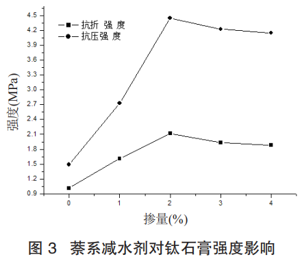 由表 2 和圖 1 的可知,萘系減水劑對(duì)鈦石膏的強(qiáng)度提升明顯,其中摻量為 3% 時(shí),強(qiáng)度提升值最多,抗折強(qiáng)度提升 0.5MPa,抗壓強(qiáng)度提升 1.2MPa。