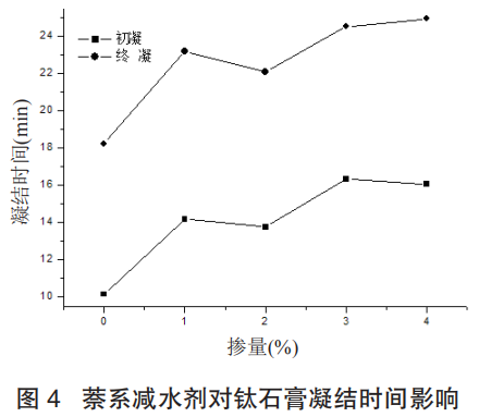 為了研究減水劑對(duì)鈦石膏性能的影響,選取萘系、聚羧酸類兩種常用的石膏減水劑,每種減水劑的摻量分別為石膏樣品重量的 1%、2%、3%、4%,測(cè)定減水劑種類及摻量對(duì)脫硫建筑石膏凝結(jié)時(shí)間、力學(xué)性能的影響,從而確定最佳的減水劑種類和用量。