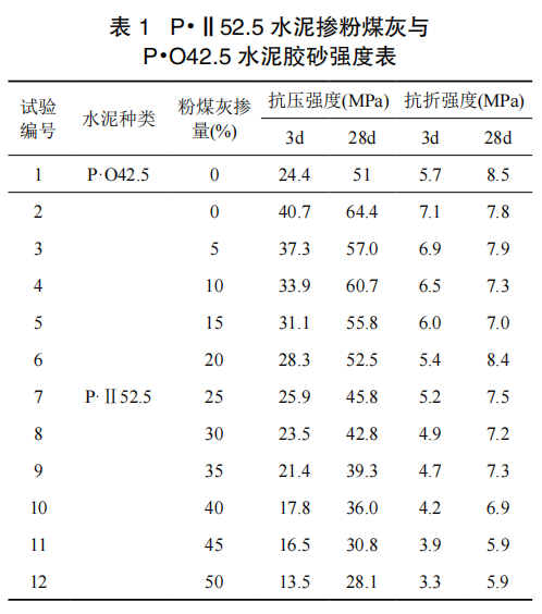 表 1 和圖 1為 P·Ⅱ52.5 水泥摻 0~50% 粉煤灰與純 P·O42.5 水泥的膠砂強(qiáng)度對比試驗(yàn)結(jié)果。