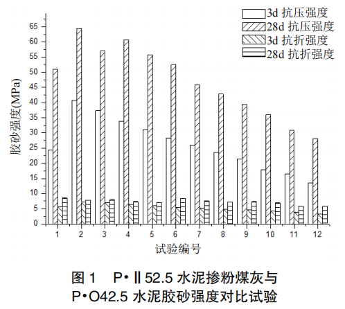 試驗(yàn)結(jié)果表明,隨著 P·Ⅱ52.5 水泥膠砂試件中粉煤灰摻量的增大,膠砂試件的抗折強(qiáng)度和抗壓強(qiáng)度基本呈現(xiàn)下降趨勢。