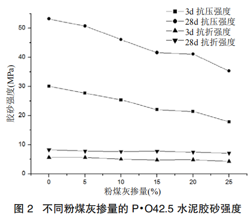 2.2 粉煤灰摻量對 P·O42.5 水泥膠砂強(qiáng)度的影響