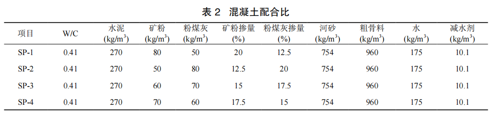 為了確定礦物摻合料的最優(yōu)摻量,以及減少砂率、水膠比、漿骨比等因素的影響,制定大量的膠砂配合比并按照配比制備 40mm×40mm×160mm 的膠砂試塊,然后進行 3d、7d、28d 抗壓強度測試,最后得出:當(dāng)?shù)V物摻合料的取代率為 37% 時,膠砂試塊的抗壓強度最大。試驗以膠砂配合比為參考,以相同取代率(37%)為條件,對混凝土配合比進行設(shè)計優(yōu)化,得到以下幾組混凝土配合比,如表 2 所示。