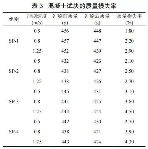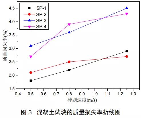 由圖 3 中可知,當(dāng)模擬海水沖刷速度為 0.5m/s、0.8m/s 時,SP-1 所對應(yīng)的配合比制備的混凝土試塊的耐沖刷性能最好;當(dāng)沖刷速度達到 1.25m/s 時,SP-2 所對應(yīng)的配合比混凝土試塊的耐沖刷性能最好。從圖中還可以看出,隨著沖刷速度的增大,SP-1 對應(yīng)的折線的斜率幾乎不變,但 SP-2 對應(yīng)的折線的斜率在減小,說明當(dāng)沖刷速度繼續(xù)增大,SP-2 對應(yīng)的配合比混凝土試塊的質(zhì)量損失率的增加速度與 SP-1 相比逐漸減小,兩者的質(zhì)量損失率的差距逐漸增大。從表 3 中可以看出,當(dāng)沖刷速度為 0.5m/s 時,SP-1 對應(yīng)配合比混凝土試塊的質(zhì)量損失率比 SP-2、SP-3、SP-4 分別降低 14%、42% 和 52%;當(dāng)沖刷速度為 0.8m/s 時,SP-1 對應(yīng)的配合比混凝土試塊的質(zhì)量損失率比 SP-2、SP-3、SP-4 分別降低 12%、39% 和 44%;當(dāng)沖刷速度為 1.25m/s 時,SP-2 對應(yīng)的配合比混凝土試塊的質(zhì)量損失率比 SP-1、SP-3、SP-4 分別降低 7%、40% 和 37%。根據(jù)數(shù)據(jù)對比以及折線圖比較,當(dāng)沖刷速度<1m/s 時,SP-1 對應(yīng)的配合比混凝土試塊的耐沖刷性能最好;當(dāng)沖刷速度>1m/s 時,SP-2 對應(yīng)的配合比混凝土試塊的耐沖刷性能最好,所以試驗人員可以根據(jù)混凝土所處的實際環(huán)境來選擇合適的配合比。
